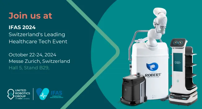 United Robotics Group is proud to participate in IFAS 2024, Switzerland's leading trade fair for healthcare professionals. From October 22 to 24, 2024, at Messe Zurich, we will showcase our latest innovations in healthcare and service automation. You can find us at Hall 5, Stand B29, where we’ll present live demonstrations of three cutting-edge robots: ROBERT, uClean Compact, and uServe.