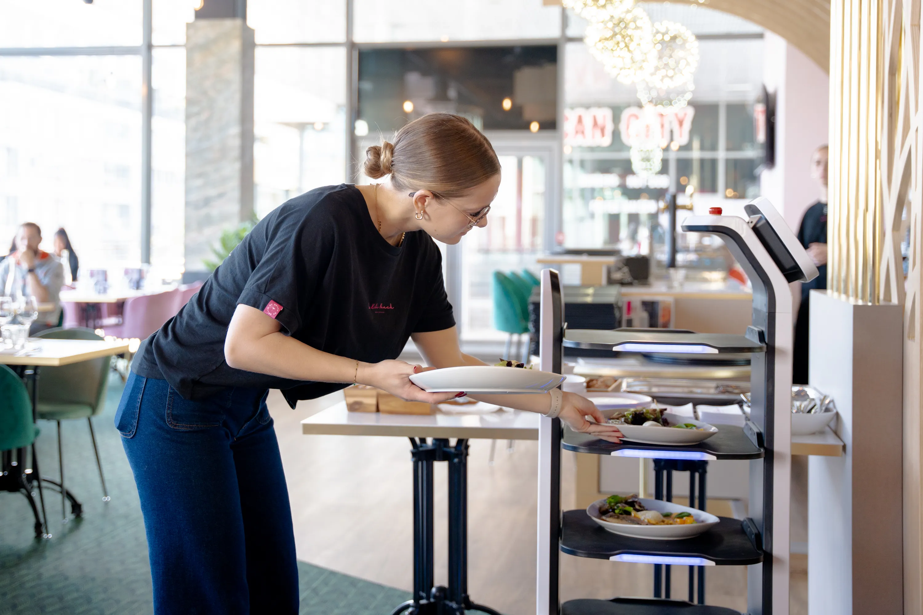 Sa capacité à recevoir des commandes via commande vocale ou tablette et à naviguer de manière autonome dans des espaces restreints permet à uServe de se fondre harmonieusement dans l'environnement d'un restaurant. Il a été pensé pour assurer une collaboration intuitive avec les équipes.